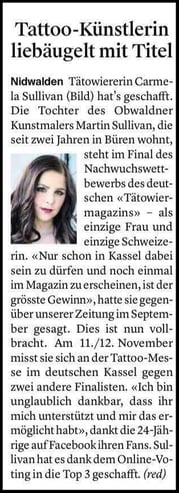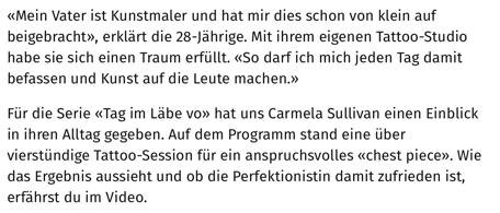 «Unter diesen Umständen zu tätowieren war für mich eine neue Herausforderung. Die vielen schreienden Fans, der Beat und die Bewegungen der Bühne und Musikboxen die ich auf der Haut der Kundin gespürt habe während dem tätowieren, die Rauchanlage, die Lichtershow und vieles mehr haben es zu einem unvergesslichen Moment gemacht. Während dem Tätowieren nahm ich mir einige Sekunden Zeit diesen Moment zu geniessen, die Freude der Fans zu sehen und den Moment bewusst zu erleben, neben Loco Escrito auf der Bühne zu sein. Ein weiteres Highlight war, das ich Loco Escrito mein Bild auf der Bühne übergeben durfte. Die Fans und er selber waren total begeistert »